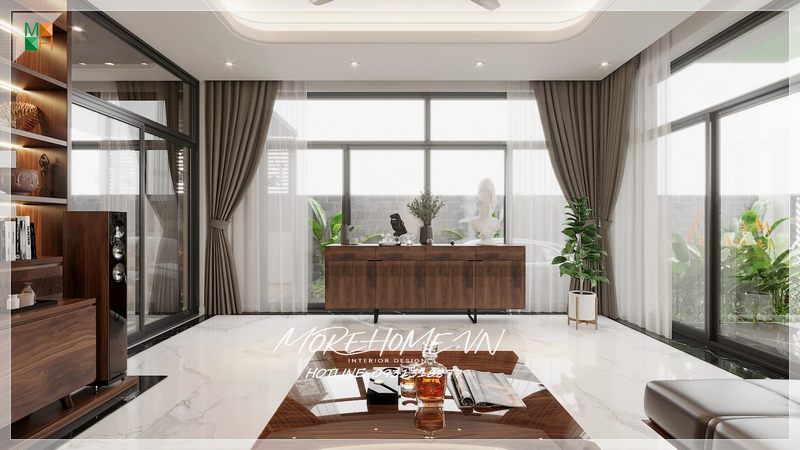Vẻ đẹp sang trọng của mẫu thiết kế phòng khách biệt thự hiện đại được tạo nên bởi sự kết hợp của ba chất liệu: đá, kính và gỗ óc chó cao cấp.