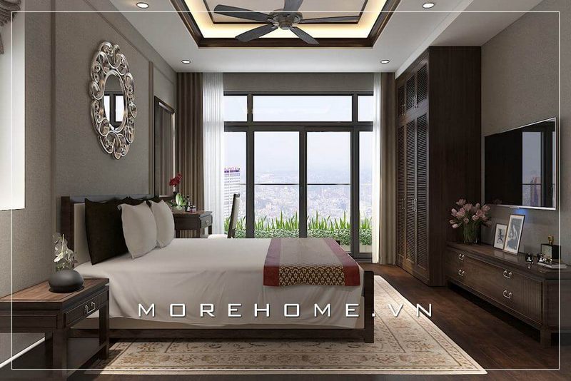 Phòng ngủ của căn hộ hiện đại và sang trọng được trang trí bằng gam màu nâu trầm, đồ nội thất mang lại vẻ đẹp tinh tế vô cùng.
